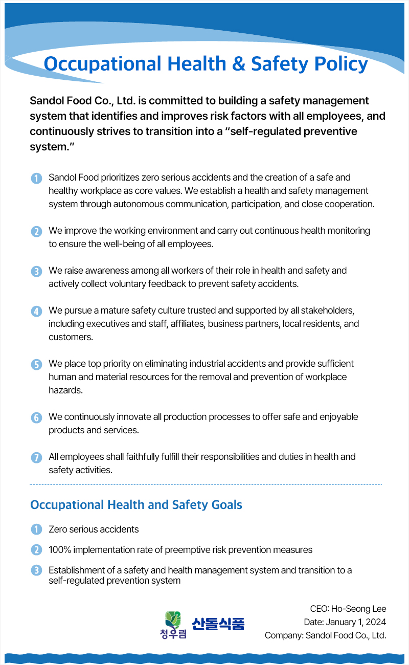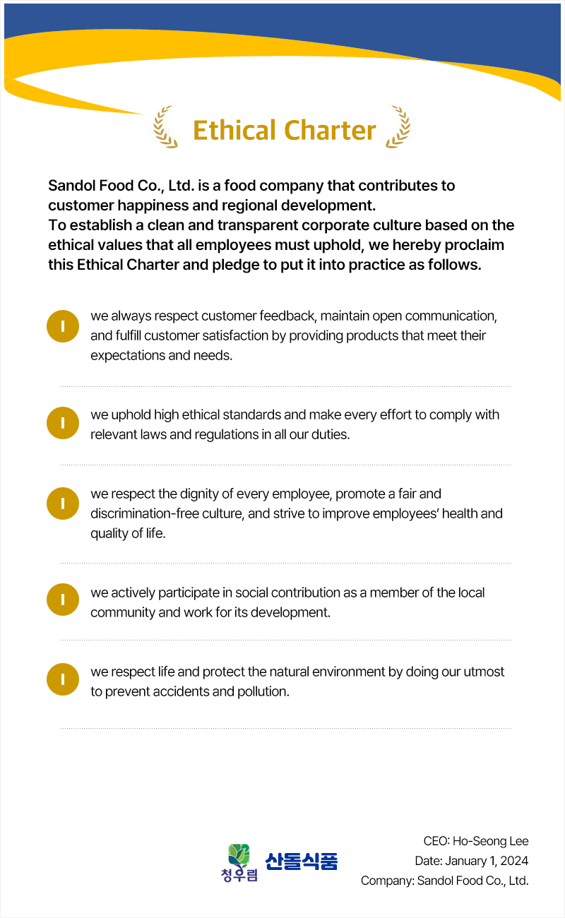 Sandol Food Co., Ltd. has established and manages 4 strategic tasks and 13 action plans to promote transparent management.