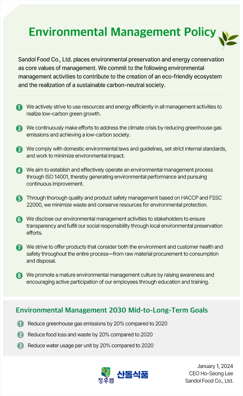 Sandol Food Co., Ltd. has established and manages 5 strategic tasks and 20 action plans to promote environmental management.