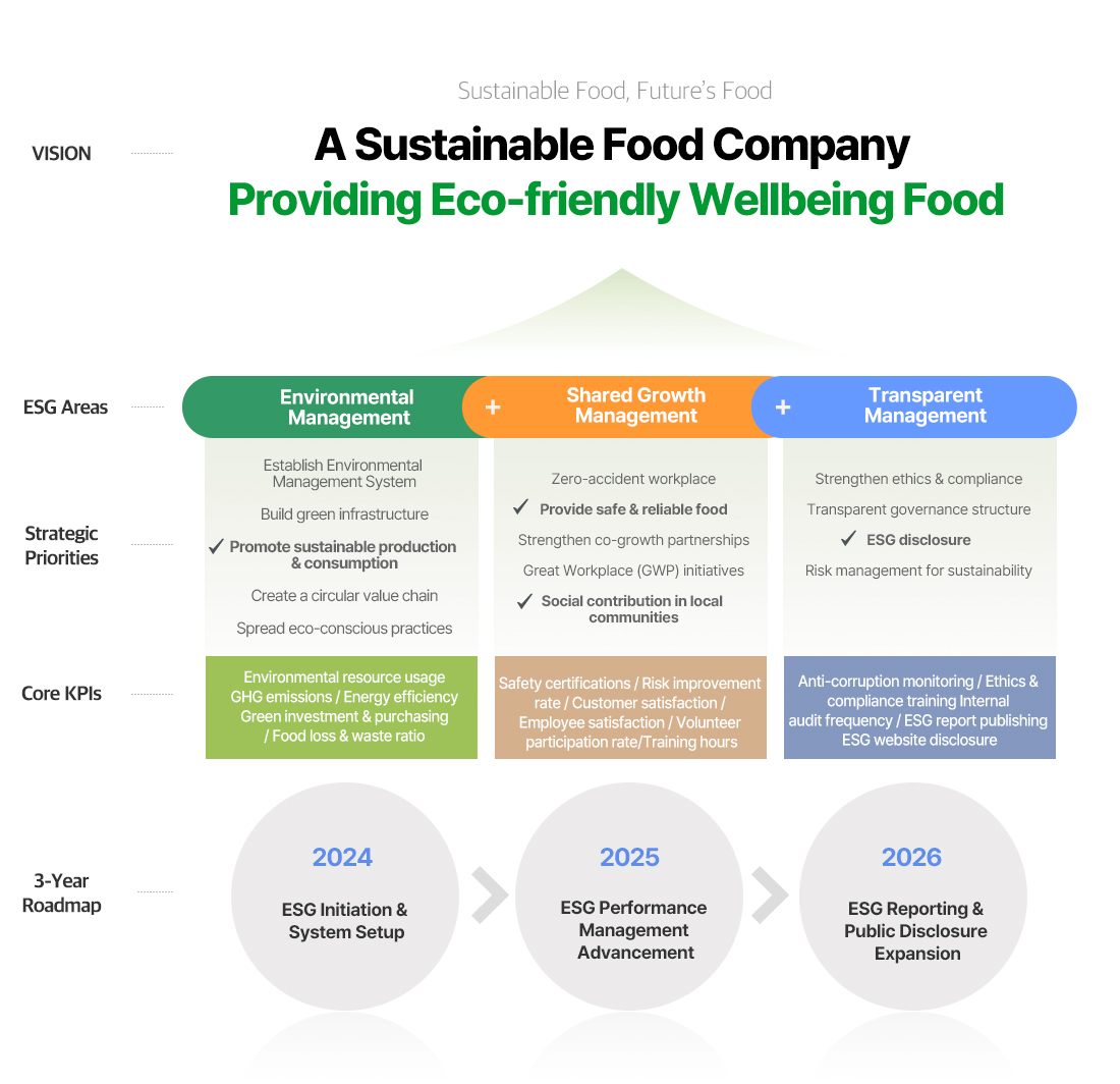 With a deep commitment to prioritizing the safety and health of our customers, we strive to lead ESG management as a sustainable food company that delivers eco-friendly wellbeing food.